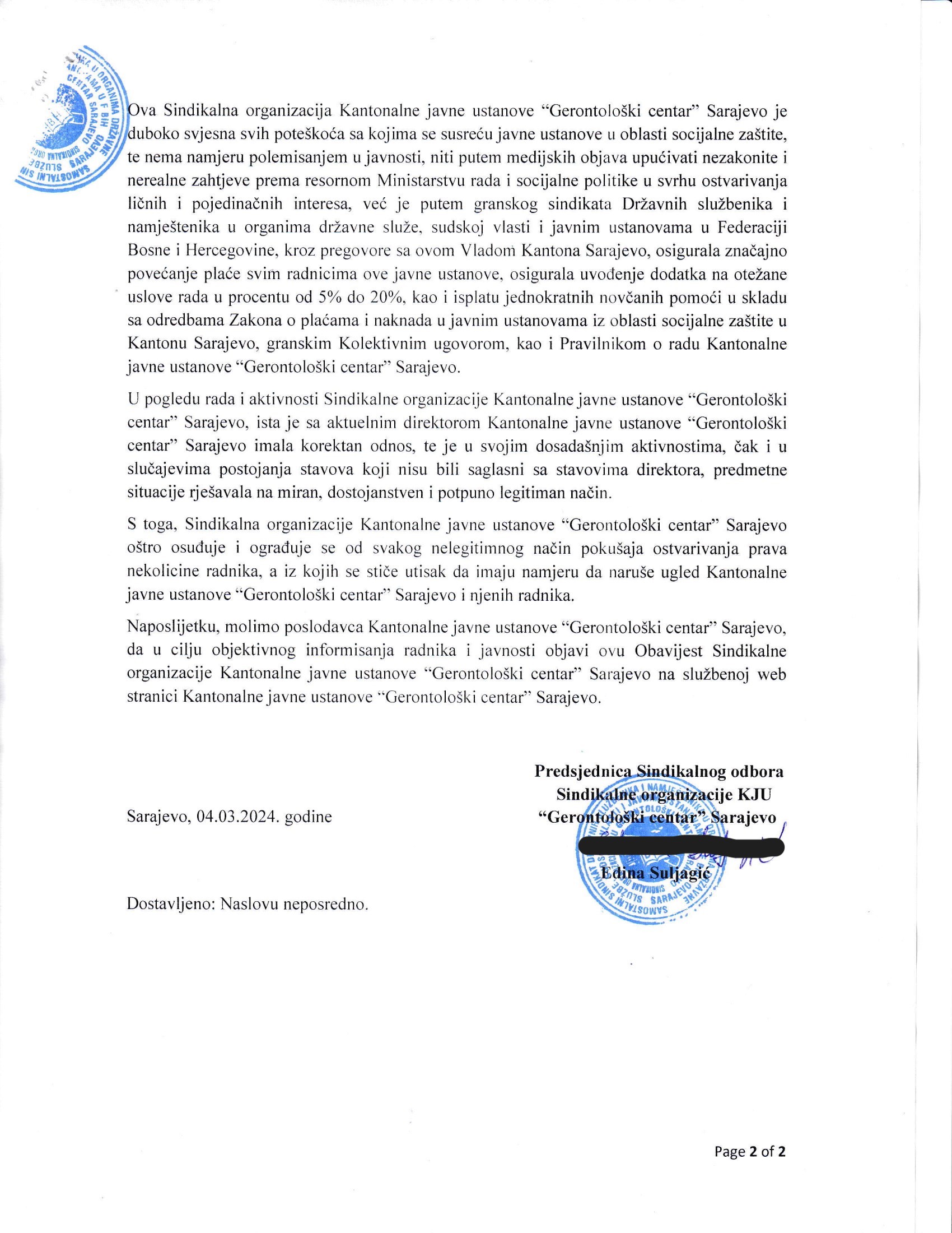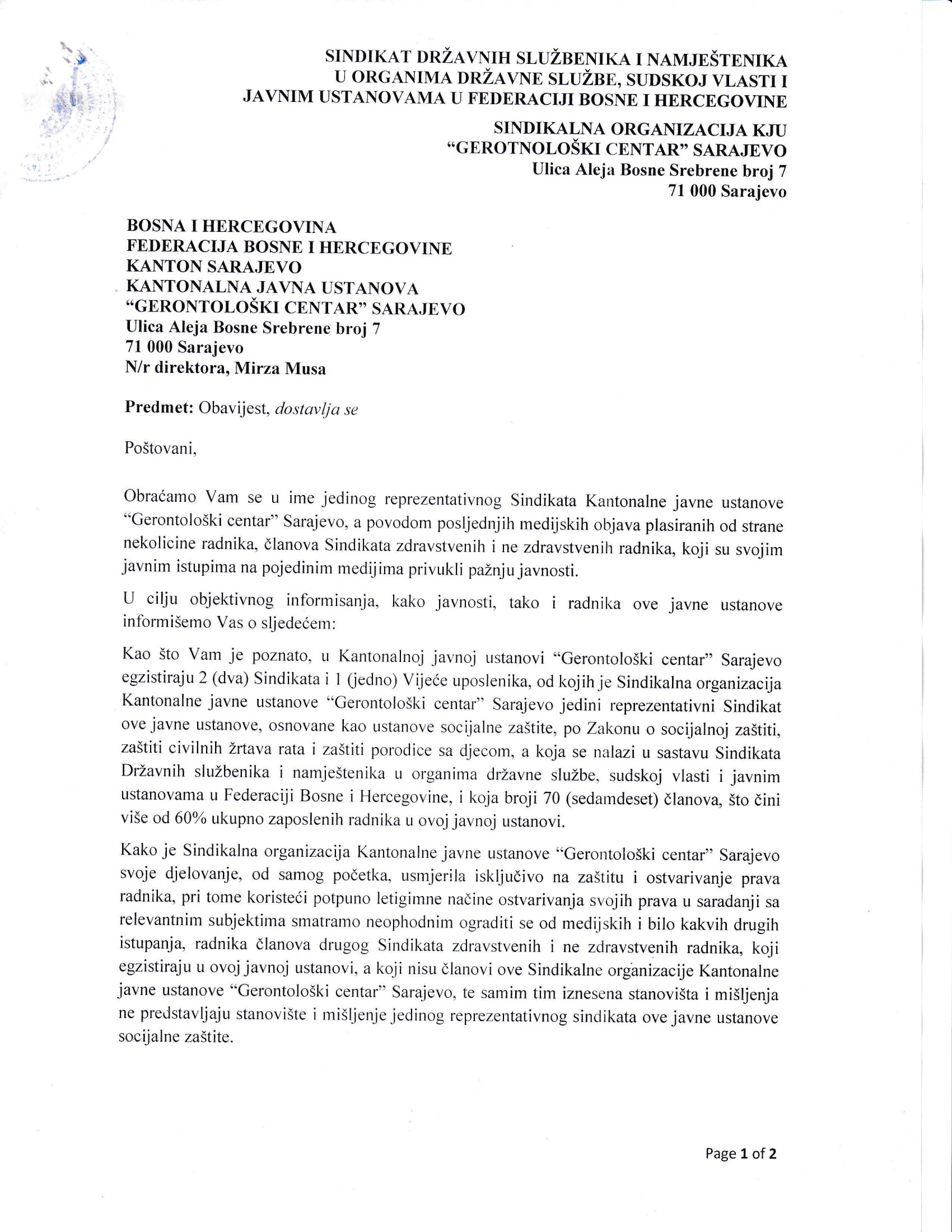 Na osnovu Odluka Upravnog odbora Kantonalne javne ustanove „Gerontološki centar“ Sarajevo i Odluka direktora KJU „Gerontološki centar“, Kantonalna javna ustanova „Gerontološki centar“ objavljuje
