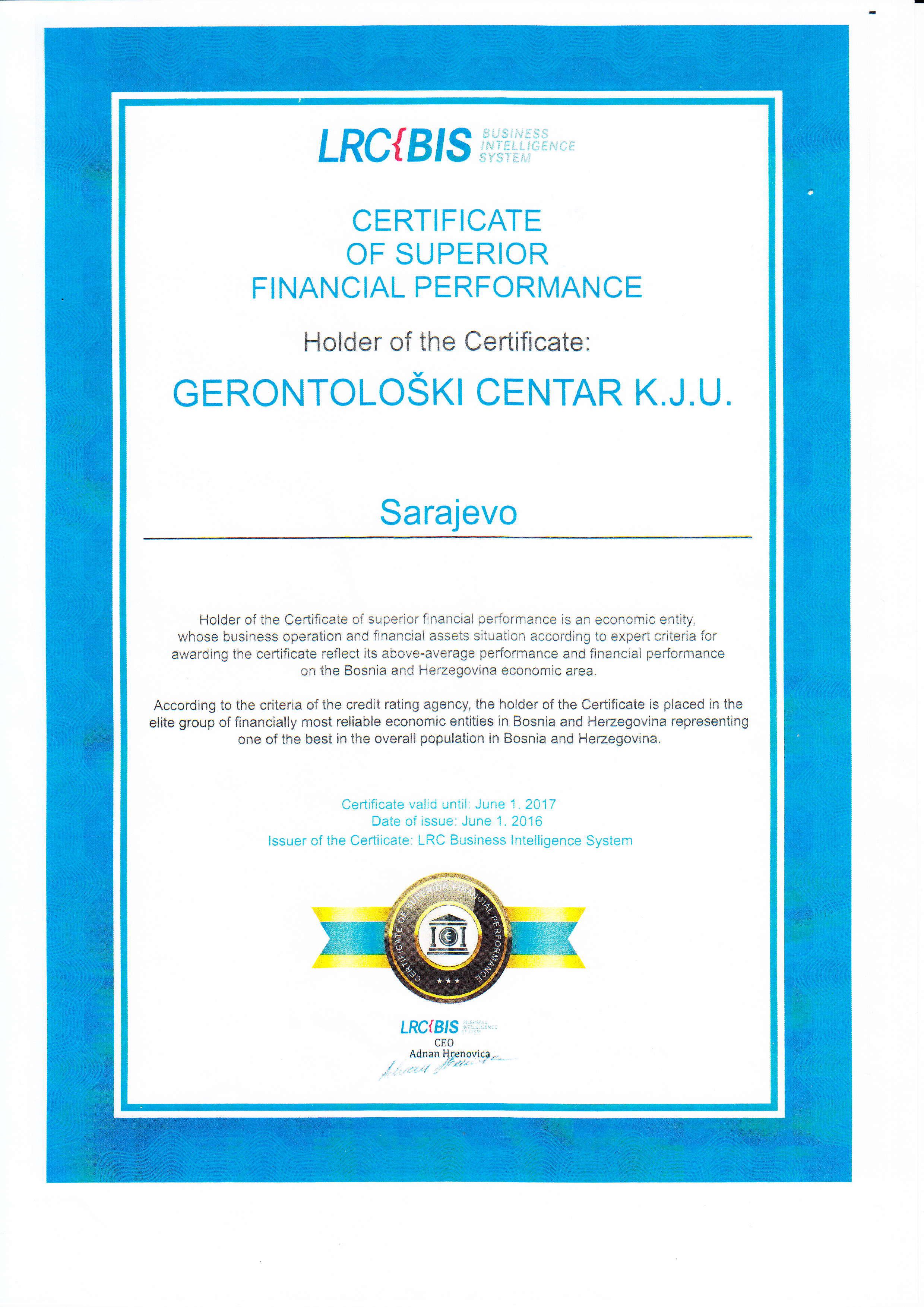 U sklopu LRC-ovog projekta Bonittetne certifikacije preduzeća u BiH, KJU "Gerontološki centar" Sarajevo se u skladu s ostvarenim poslovnim rezultatima izdvojila kao natprosječna te se svrstala u sami vrh bonitetno pouzdanih partnera.
